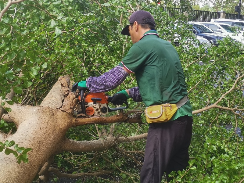 防御工作不仅包括常规的排水口清理和预警信息发布,更注重对潜在风险的预判和针对性处置。各项目将预案转化为具体操作,严守防汛要害:针对地下车库等重点区域,除了用沙袋筑垒,还提前通过安装防水挡板并进行密封压力测试的预演;工程团队对排水泵进行双路供电切换实操,确保在主电源中断时,备用电源能无缝接管。清理高空隐患:秩序团队对天台门、广告牌等实施强制加固或临时拆除;绿化团队则对高大树木采取“修剪减负+撑杆加固”的双重保险,最大限度降低高空坠物风险。应急能力到位:在风雨增强前,抢险小组完成最后一轮装备清点和流程复习,确保人员熟练、设备可用、响应及时。